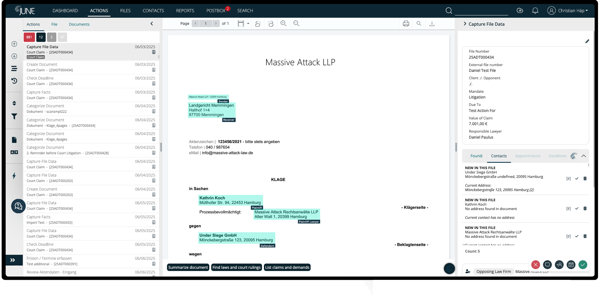 Forget about browsing through data manually. JUNE identifies parties in litigation processes, courts, deadlines, claims, decisions and rulings, dates, addressees, and more. All the data required to process cases is extracted automatically, and you can always cross-reference information and data sources while having the system summarize documents and key information.